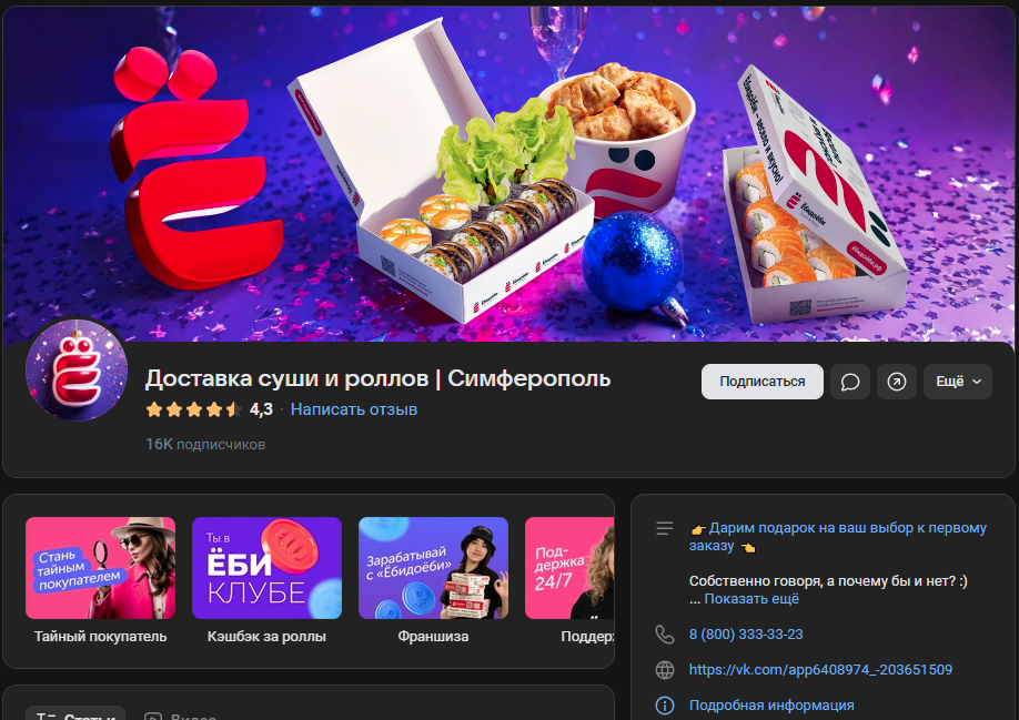 Для компании, работающей в сфере доставки еды, важнейшими задачами являются привлечение новых клиентов, повышение их лояльности и удержание на платформе. В этом кейсе мы расскажем, как мы помогли службе доставки суши и роллов Ёбидоёби в Симферополе эффективно использовать ВКонтакте для достижения этих целей.